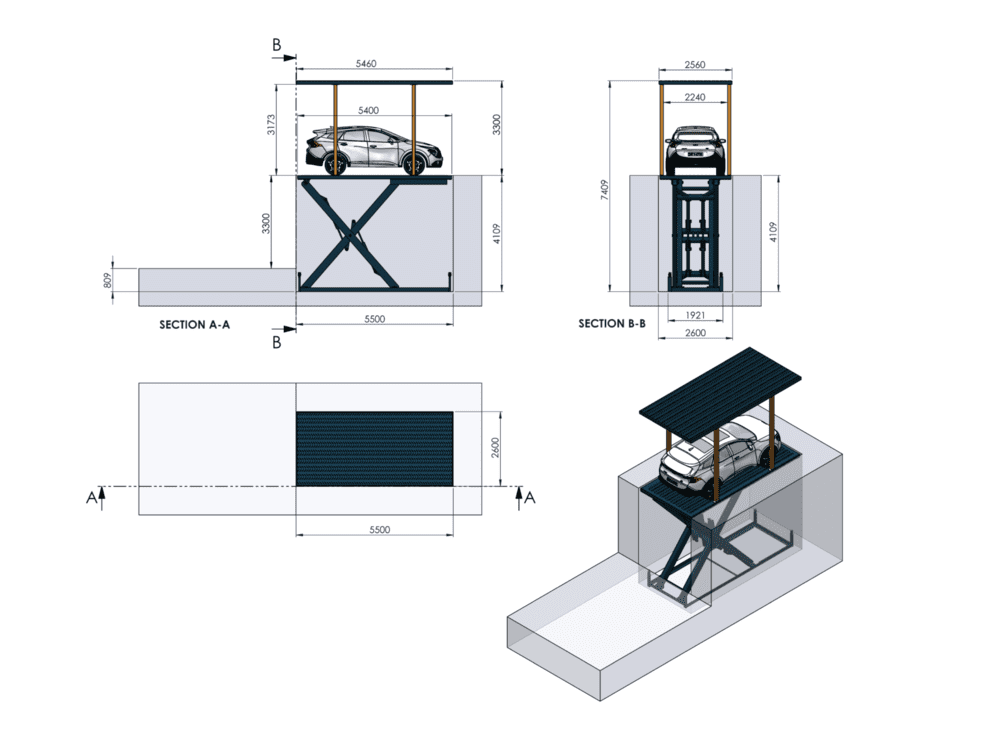 An elevator for custom places & levels, also works as independent parking system. it’s posible to use paved canopy to integrate with the surrounding architecture.
